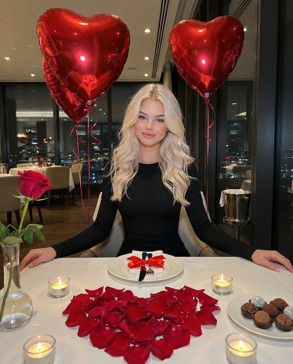 A detailed prompt for generating a cinematic editorial image of a young woman at a luxury Valentine's Day dinner, focusing on realistic textures, warm ambient lighting, and high-end props like heart-s