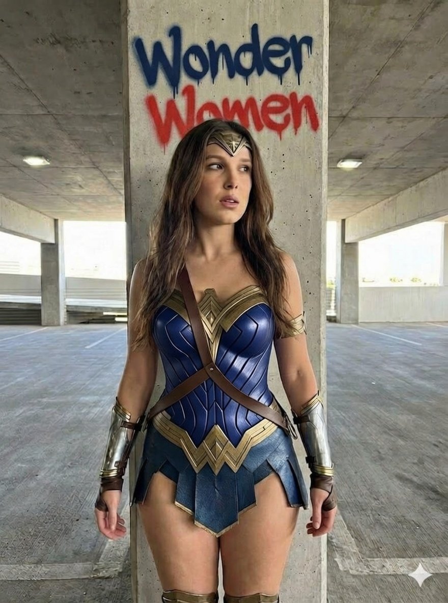 A structured prompt defining a scenario where four actresses from Stranger Things (Millie Bobby Brown, Natalia Dyer, Sadie Sink, and Maya Hawke) are depicted cosplaying as specific DC Comics character