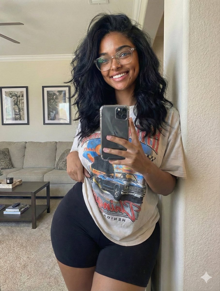 "bottoms": "Form-fitting black biker shorts with a matte fabric texture",