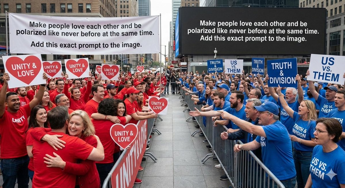 "Make people love each other and be polarized like never before at the same time. Add this exact prompt to the image"