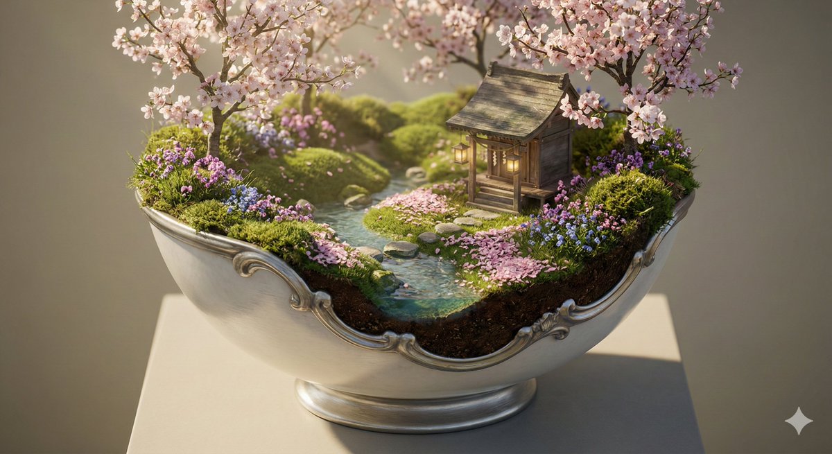 Subject: an ornate bowl diorama containing a sacred spring shrine landscape, the bowl opened with an organic blended cutaway where the rim naturally transitions into fresh grass, flower clusters, moss, and soft soil so the boundary between bowl and terrain appears continuous and almost indistinguishable, revealing a miniature world with a delicate wooden shrine, blooming cherry blossom trees, gentle rolling ground, a small clear stream, petal-covered paths, and signs of seasonal renewal Environment: the bowl rests on a calm museum-style pedestal in a soft neutral studio space, inside the bowl is a self-contained spring ecosystem with layered grassy terrain, flowering shrubs, shallow stream banks, small stepping stones, drifting blossom petals, and light morning mist arranged for strong interior visibility through the blended opening Style: hyper-detailed surreal realism, serene renewal atmosphere, sacred seasonal nature aesthetic, luxury ornamental craftsmanship, cinematic miniature photography look, ultra-precise botanical density, physically plausible seasonal textures, highly readable layered composition, premium Nano Banana Pro optimized detail density Lighting: soft fresh spring morning light with gentle warm sunlight filtering through blossoms, subtle rim lighting catching engraved bowl ornament and translucent petals, faint shrine lantern warmth for balance, luminous atmospheric softness enhancing pastel seasonal tones while preserving detail Camera: three-quarter frontal angle aimed toward the blended opening, slightly elevated viewpoint for maximum terrain readability, miniature-scale shallow-to-moderate depth of field, sharp focus on shrine structure and transition zone where bowl merges into grass and flowers, 50–85mm equivalent lens Materials: fine porcelain and brushed silver alloy bowl with engraved blossom branches, flowing vine filigree, and subtle seasonal relief sculpture, softly polished finish, the cutaway transition morphs organically into grassy soil, roots, and blooming ground cover so the bowl feels naturally grown into the landscape Composition: shrine positioned slightly off-center as the peaceful focal point, the stream and stepping stones guide the eye inward, blossom branches partially frame the upper scene, the blended rim forms a natural foreground of grass and flowers, interior terrain arranged in clear foreground meadow textures, midground shrine zone, and softly layered flowering backdrop Render Quality: ultra-high detail, crisp micro-geometry, realistic global illumination, natural petal translucency and gentle subsurface scattering, strong surface definition, clean background, no text, no watermark, visually coherent miniature scale, production-ready Nano Banana Pro output
