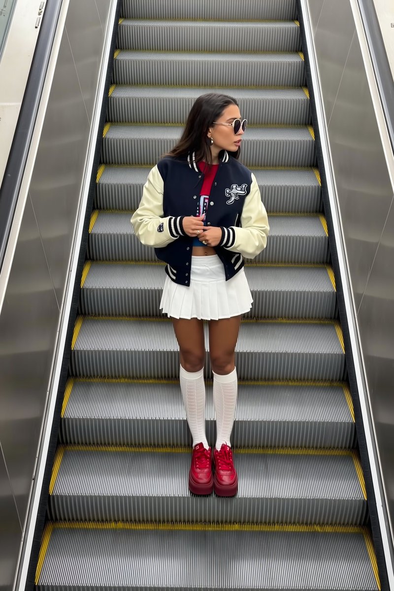 The model wears a cropped varsity jacket paired with a crisp white pleated mini skirt and tall white socks, styled with bold red platform sneakers that pop against the neutral tones of the escalator steps. Heart-shaped sunglasses add a spirited retro-pop flair to her look. She stands with a relaxed, playful posture, her gaze casually directed to the side, embodying a youthful, fashion-forward aesthetic. Soft, ambient indoor lighting bathes the scene evenly, gently accentuating the texture of the pleats, knit socks, and smooth leather of the sneakers, resulting in an editorial feel that balances spontaneity with polished style typical of elevated TikTok escalator fit checks.