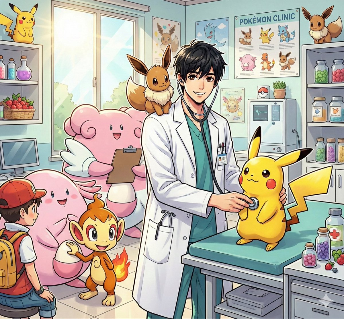 『Please create an image of the person in the attached illustration working as a doctor (your profession) in the world of Pokémon. Also, please consider a Pokémon that suits this person's impression.』