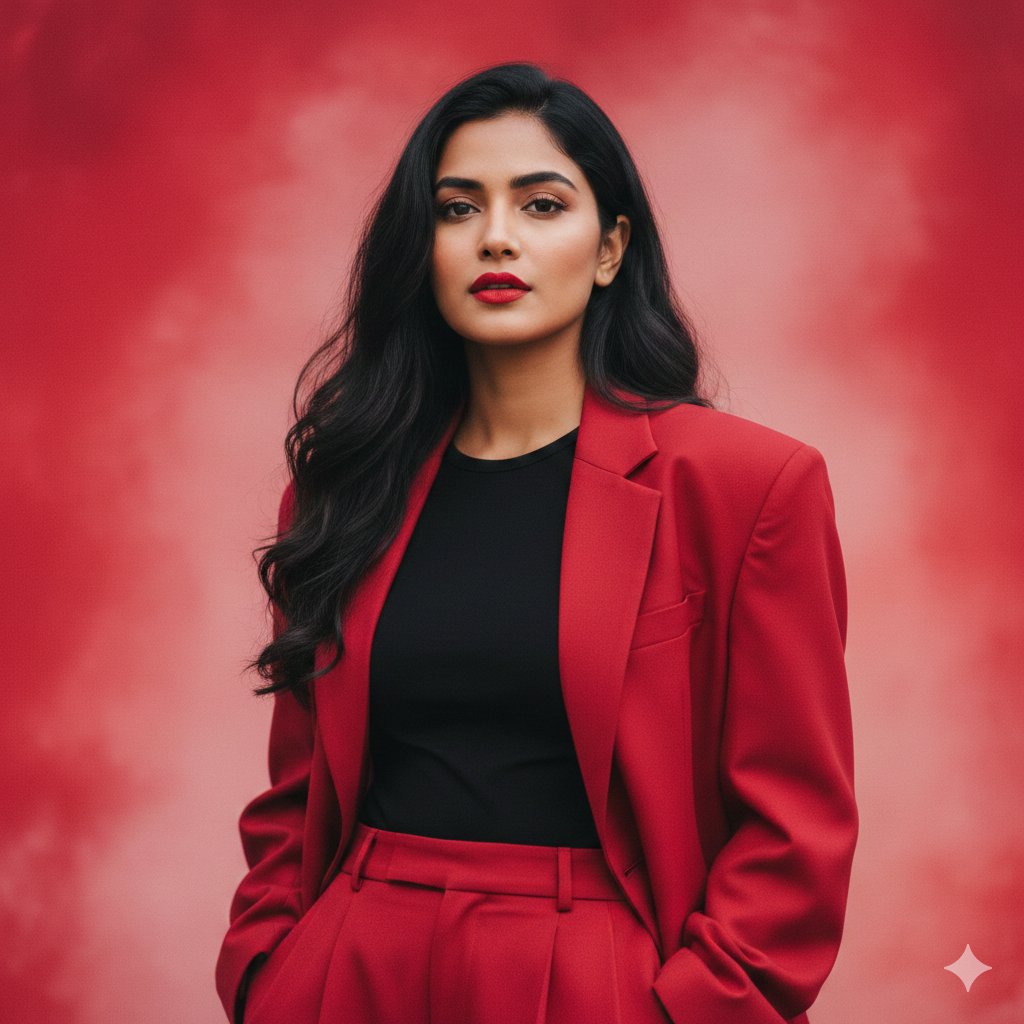 Create a ultra-realistic HD DSLR Potrarit of A beautiful Indian woman with long, dark, wavy hair, wearing a red oversized suit jacket and matching trousers. She has a black top underneath her jacket. She has subtle makeup with defined eyebrows bright red lips and a serene expression. The background is a mix of red and pink. Don't change the face. Face must match with the reference picture.