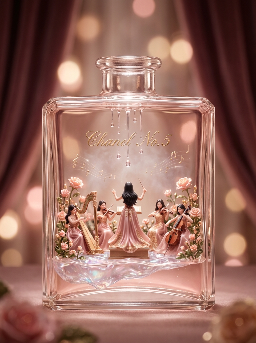 A scaled-down world inside a Chanel No. 5 perfume bottle, crystal-clear serum forming a pool, miniature rose bushes and glowing flora, miniature musicians playing harps, violins, and cellos, and a woman conductor standing poised.