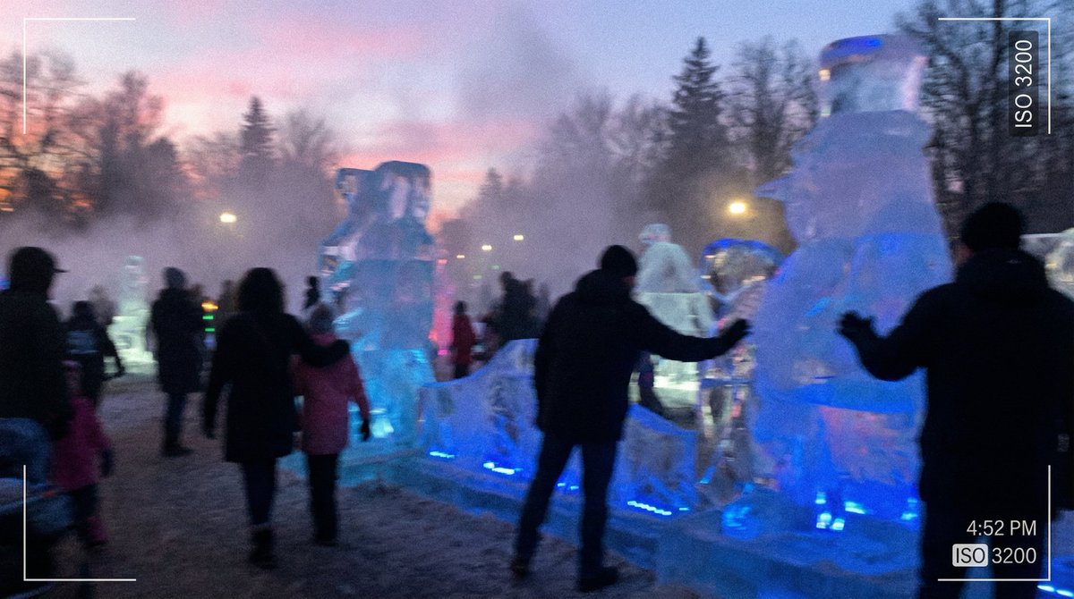 A prompt for generating a candid, authentic iPhone-style photo of an ice sculpture installation at dusk, emphasizing natural motion blur, visible noise from high ISO, cool glacier blue lighting, and a