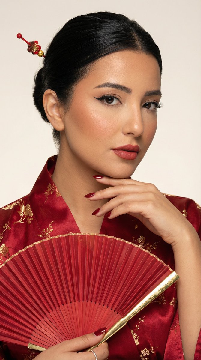 "scene_summary": "High-end editorial beauty portrait with a Japanese-inspired red kimono styling. A matching folding fan and elegant hairpin accessory. Harmonized makeup and nails.",