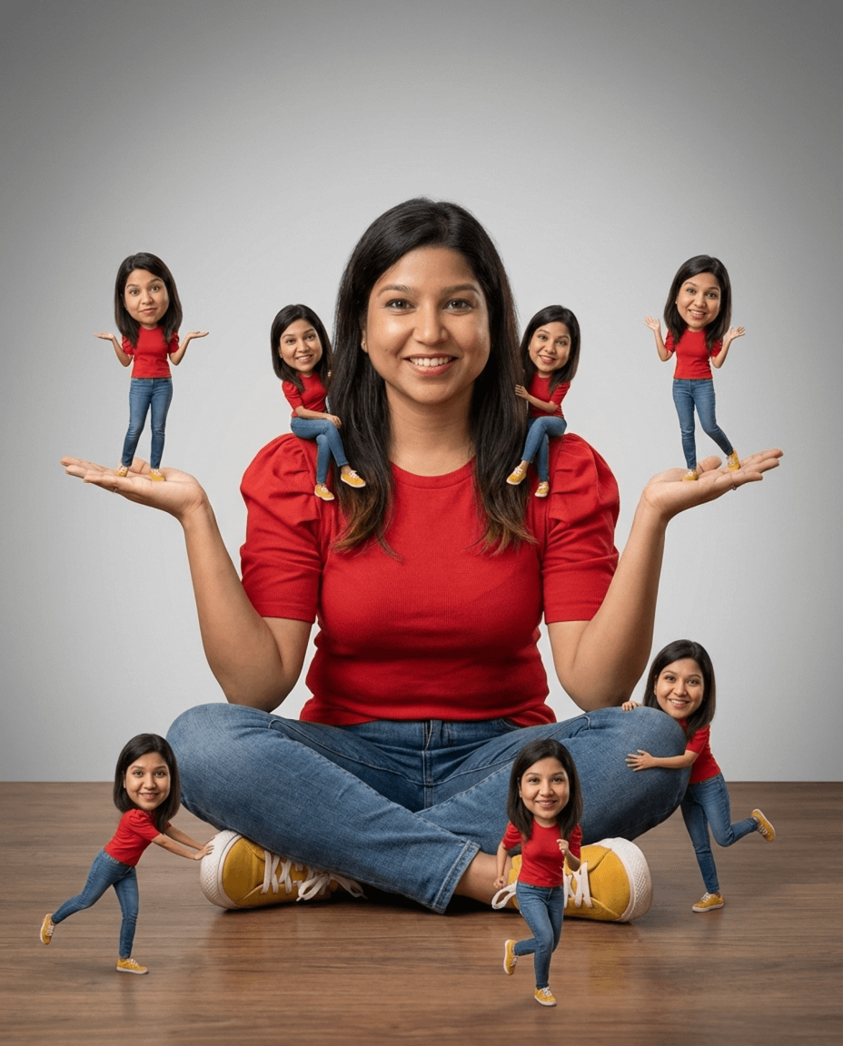 'Use the uploaded reference image as the composition and pose reference. Use my uploaded face photo as the ONLY face reference for the main character. 100% identity lock: same eyes, nose, lips, jawline, skin tone, hair texture. No change in ethnicity or facial structure. Real human photorealism, no Al plastic look. Create a photorealistic cinematic portrait replicating the exact composition, pose, and surreal concept of the reference image. The main female subject is sitting cross-legged on a wooden floor with a warm smile. She wears the identical red top puff sleeevs, denim jeans and yellow sneakers shoes . Surround him with seven miniature, realistic versions of himself (all sharing my face reference with slightly enlarged heads and playful expressions). Two miniatures stand on her upturned palms, two sit on her shoulders, one pushes at her right shoe, one runs in the foreground, and one hugs her left knee from behind, matching the poses and placement from the reference image precisely. Soft high-quality studio lighting creates realistic soft shadows. Background: clean gradient grey studio wall. Ultra-sharp, highly detailed textures, cinematic depth, photorealistic lighting, 8K quality, natural skin texture, no CGI look. Negative prompt: cartoon, 3D render, anime, chibi, painting, drawing, low quality, blurry, distorted face, bad anatomy, extra fingers, missing limbs, mismatched faces, different clothing colors, warped proportions, artifacts. Aspect ratio: 4:5'