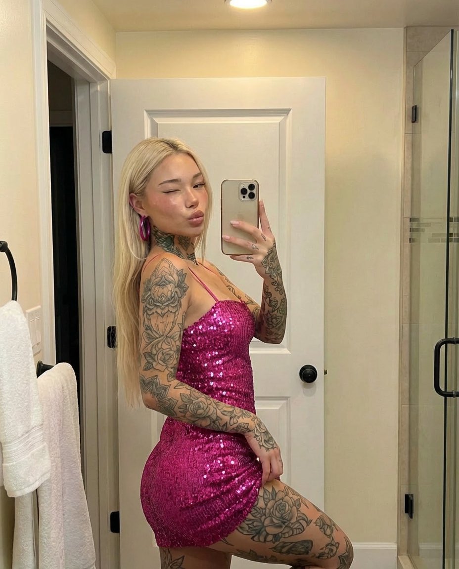 "prompt": "A mirror selfie of a confident woman with long straight {argument name="hair color" default="platinum blonde"} hair wearing a {argument name="dress color" default="hot pink"} sequin mini dress. She has detailed floral tattoos covering both arms, neck, and thigh. She is posing sideways in a bright modern bathroom with white walls, a glass shower, and soft overhead lighting. She is holding a gold smartphone and winking at the mirror with a playful kiss expression. Glam makeup, glossy lips, hoop earrings, high detail, realistic lighting, sharp focus, 4k.",