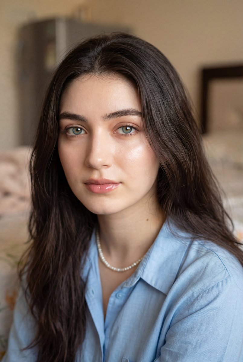 Ultra-realistic close-up portrait of a young woman with light skin, blue-green eyes, and long dark brown hair, soft natural makeup, glossy pink lips, wearing a light blue button-up shirt and a pearl necklace, soft daylight from front window, warm indoor bedroom background blurred, shallow depth of field, sharp focus on eyes, natural skin texture, high detail, DSLR quality, 85mm lens, cinematic lighting, elegant casual aesthetic