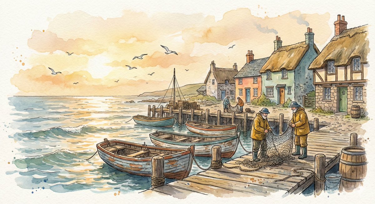 Scene: A cozy old seaside harbor village in the late afternoon with small wooden boats tied to a weathered dock, fishermen repairing nets, seagulls circling overhead, and softly rolling ocean waves reflecting warm sunlight while charming cottages line the shore. Style: Fantasy hand-drawn watercolor illustration style. Traditional watercolor rendering with visible pigment splashes, fluid paint diffusion, and softly blended tonal transitions. Delicate hand-illustrated linework with expressive drawn detailing and organic sketch-like contours. Soft, gentle color palette emphasizing airy tones and subtle saturation rather than strong contrast. Painterly layered watercolor textures combined with illustrative fantasy art aesthetics. Decorative, richly illustrated environments with numerous small background details integrated into the composition. Elegant full illustration treatment prioritizing handcrafted visual charm, artistic softness, and classic storybook-inspired fantasy rendering.