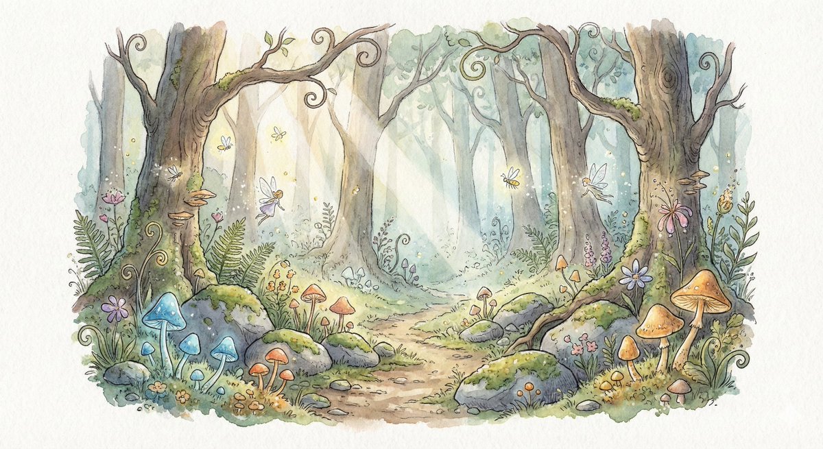 A prompt for Nano Banana Pro to generate a fantasy hand-drawn watercolor illustration. The scene is a small enchanted forest clearing at dawn, featuring glowing mushrooms, mist, and soft morning light