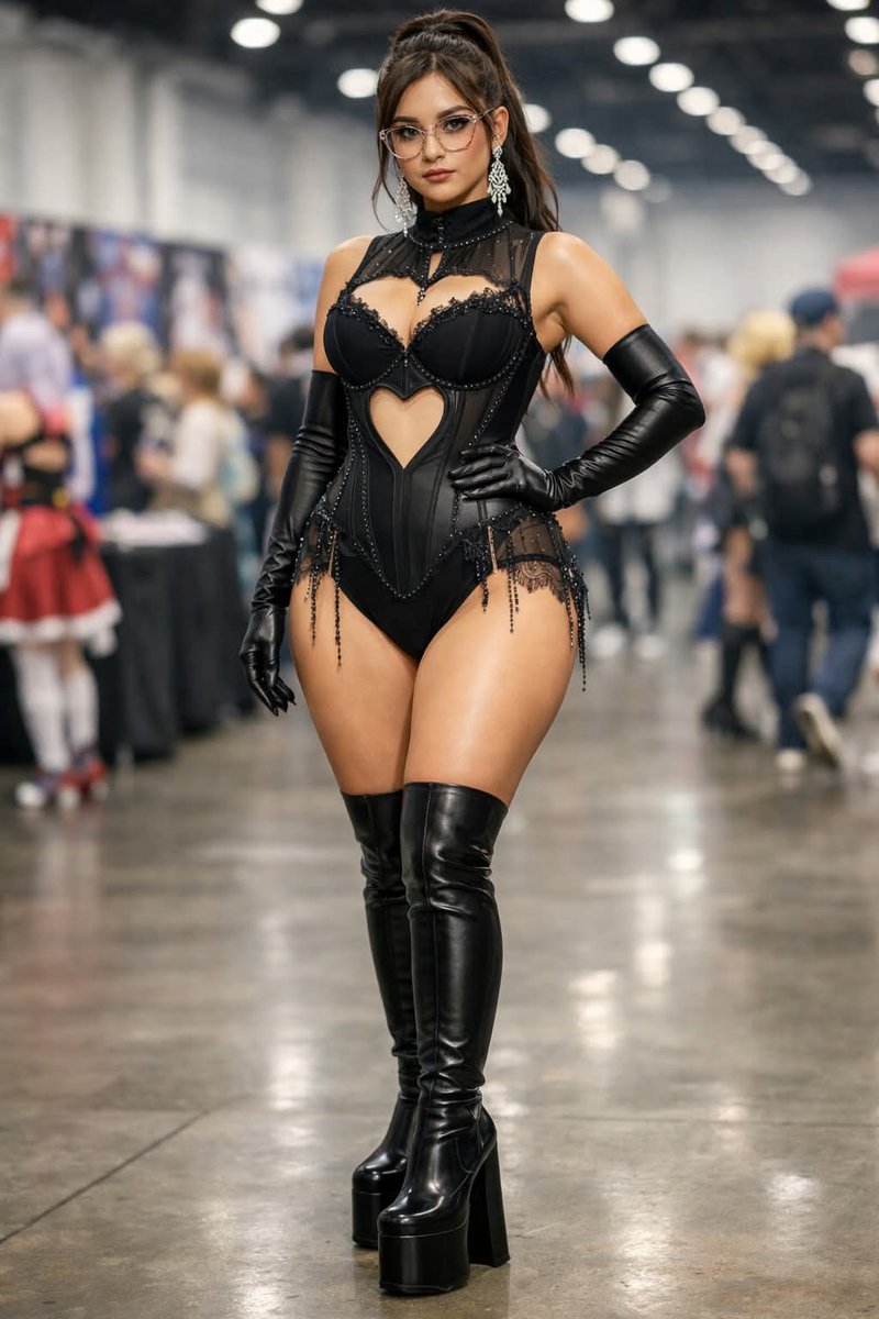 "scene_description": "A young woman posing confidently at what appears to be a convention or expo hall, wearing an elaborate black lace and leather-inspired outfit with thigh-high platform boots and long gloves. She stands in the center of a large indoor venue with blurred attendees and booths in the background.",