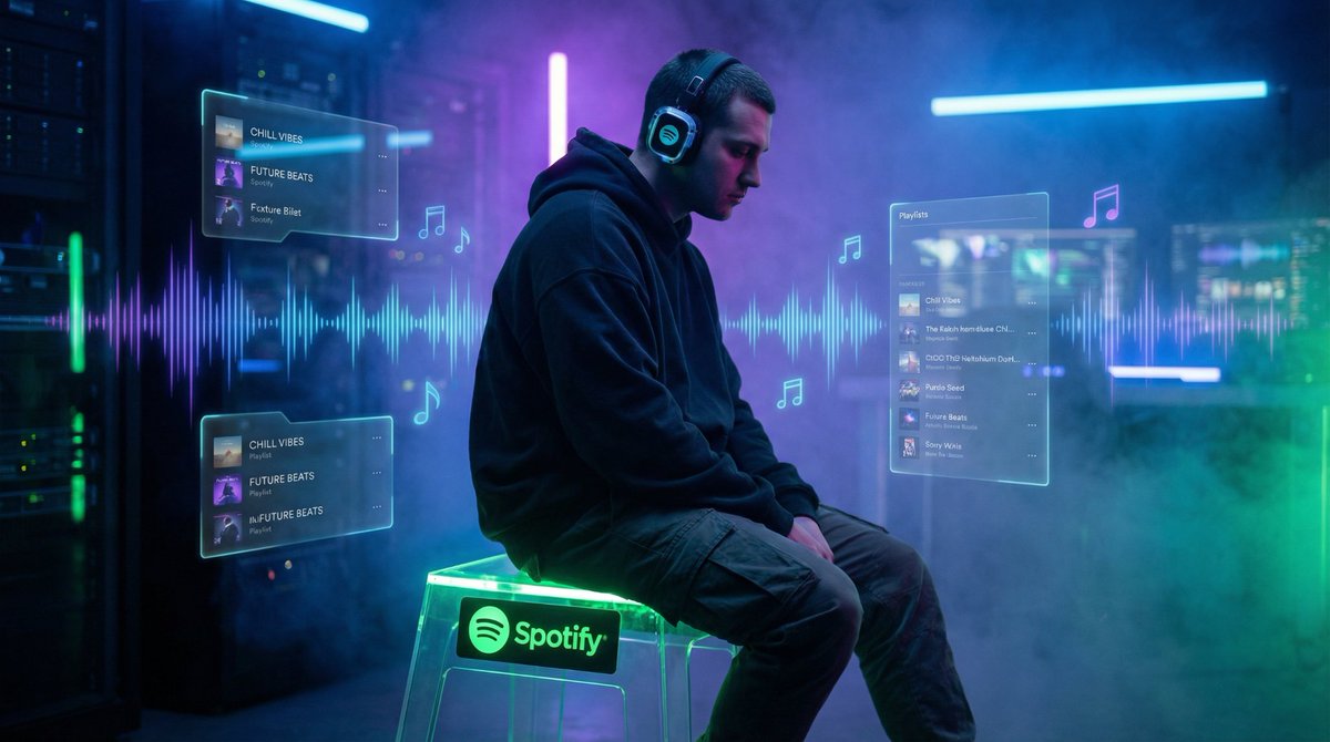 Cinematic futuristic portrait of a person in casual streetwear and headphones, seated on a neon-green glowing stool with Spotify emblem. Dark digital studio with holographic sound waves, floating notes, and playlist UI panels. Dramatic neon rim lighting, volumetric fog, ultra-realistic, high contrast, shallow depth of field, 35mm lens, 8K, immersive musical vibe --ar 16:9.