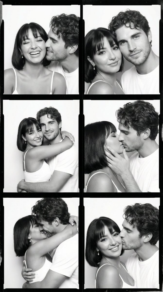 "notes": "Create a 2x3 black and white film contact sheet grid of the same young adult couple. Identity must remain perfectly consistent across all frames. Intimate, playful, candid studio moments. No text, no watermark."