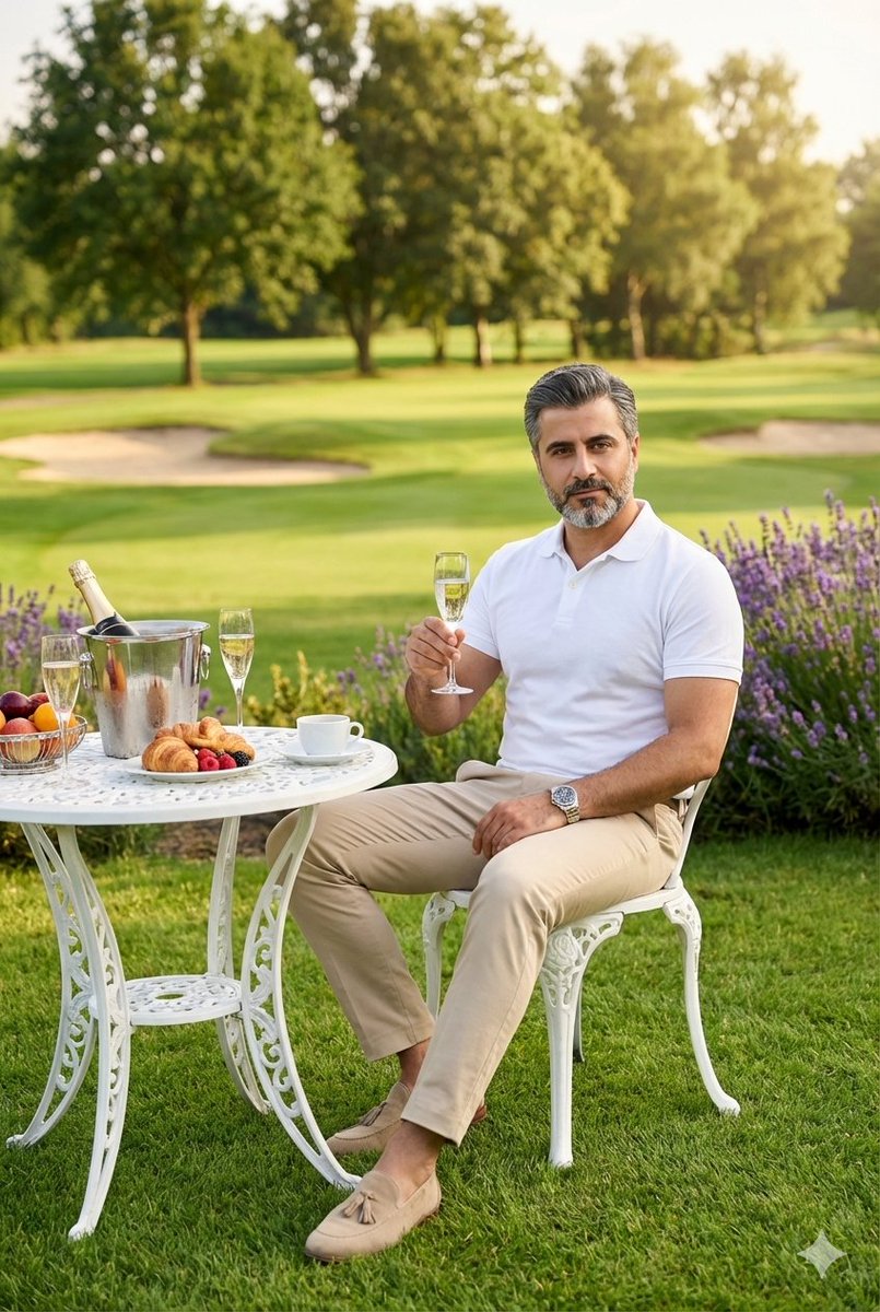 A prompt for generating a photorealistic, high-end fashion editorial image of a sophisticated middle-aged man enjoying a luxurious outdoor breakfast on a pristine golf course during the golden hour, d