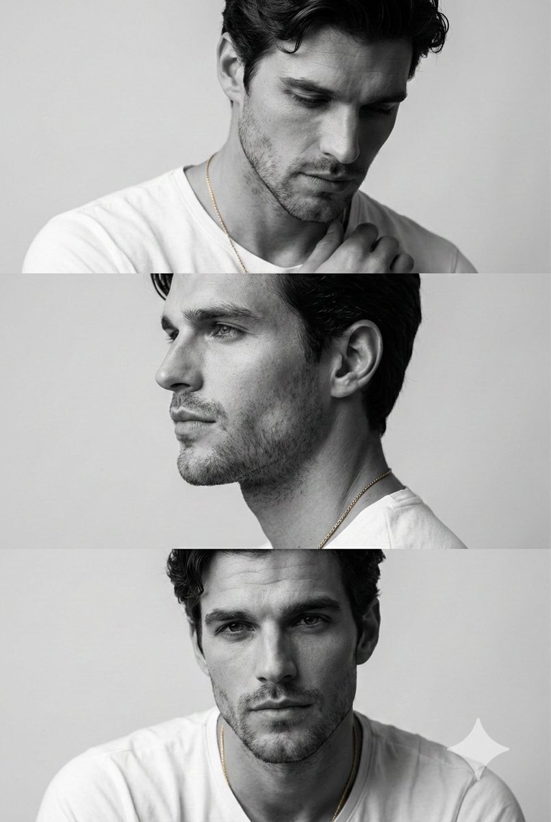 Preserve the face, proportions, and external features of the model as in the reference. A minimalist monochrome fashion editorial triptych featuring three stacked cinematic frames. The subject is a young man with short dark hair and a groomed beard. Frame 1: Emotional and introspective, looking downward with a hand near the collarbone, highlighting bone structure with Rembrandt lighting. Frame 2: A crisp profile shot with a focus on the nose, lips, and masculine jawline, gaze directed slightly upward. Frame 3: A frontal, thoughtful portrait with shoulders relaxed and direct eye contact. The composition is clean and modern, using a white T-shirt and gold necklace for visual continuity. Commercial magazine quality, high-end mirrorless camera, authentic skin pores, soft bokeh, and elegant masculinity.