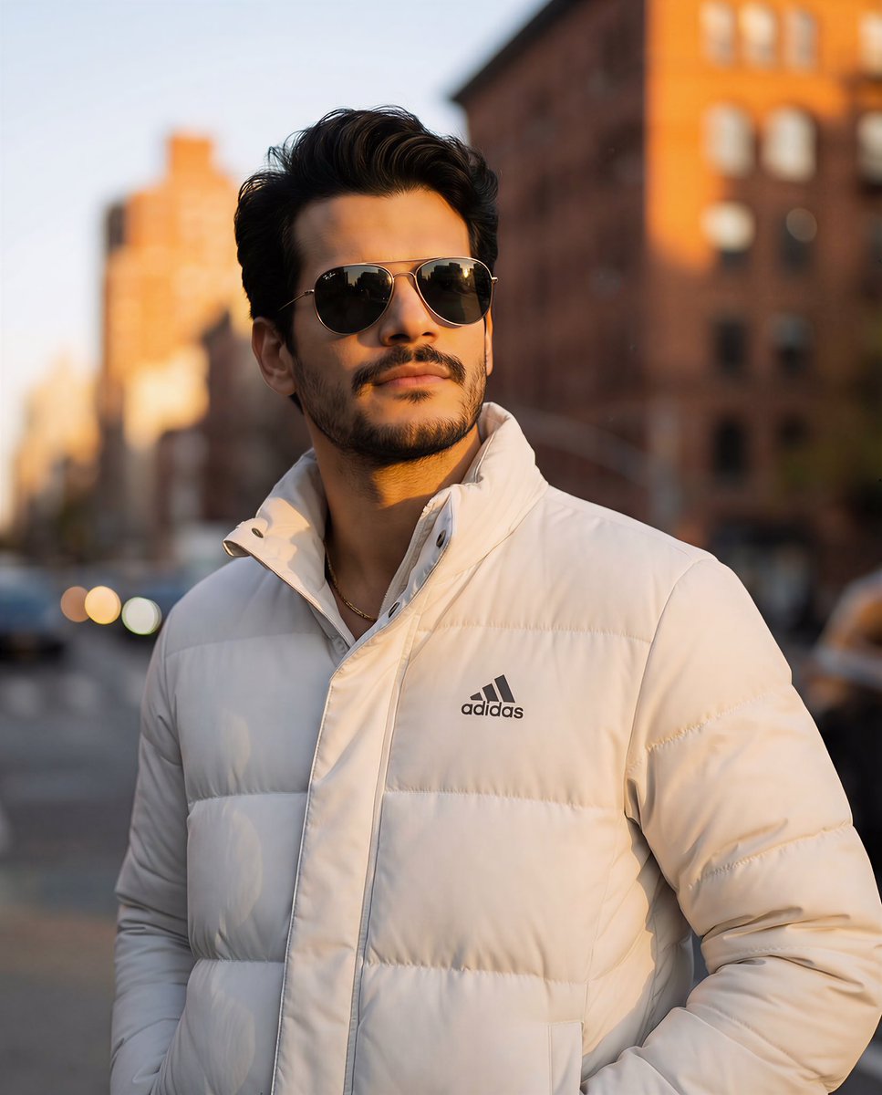 Ultra-realistic 8K cinematic portrait captured during golden hour. Warm sunset light naturally illuminates the subject’s face from a low-angle sun position, creating soft highlights and gentle shadow falloff. A young man shown in half-body framing, standing confidently with a relaxed yet powerful posture, looking slightly upward toward the horizon. Expression is serene, composed, and self-assured. Hair is voluminous and well-styled with natural texture and movement. He wears premium designer sunglasses with a refined, modern silhouette and subtle reflective lenses catching the golden light. Outfit: matte white Adidas padded puffer jacket with clean stitching and subtle fabric texture, high-quality finish, minimal branding visibility. A thin, subtle gold chain rests naturally around the neck, adding a refined luxury detail. Background: softly blurred urban city buildings during sunset, warm orange and amber tones, natural bokeh, cinematic depth separation. The environment feels elevated and modern but not exaggerated. Lighting: natural golden hour sunlight only, no artificial glow, no studio lighting. Soft rim light along hair and jacket edges. Realistic skin tones with visible natural texture, no smoothing, no beautification. Camera: full-frame mirrorless, 85mm lens, f/1.8, ISO 100, 1/500s. Shallow depth of field, sharp focus on face and upper torso. Style: modern luxury editorial photography, natural realism, high-end fashion aesthetic. CRITICAL: Use 100% of the facial features from the uploaded reference image. Do not alter facial structure, proportions, age, skin texture, identity, or expression baseline. Absolute face preservation required.