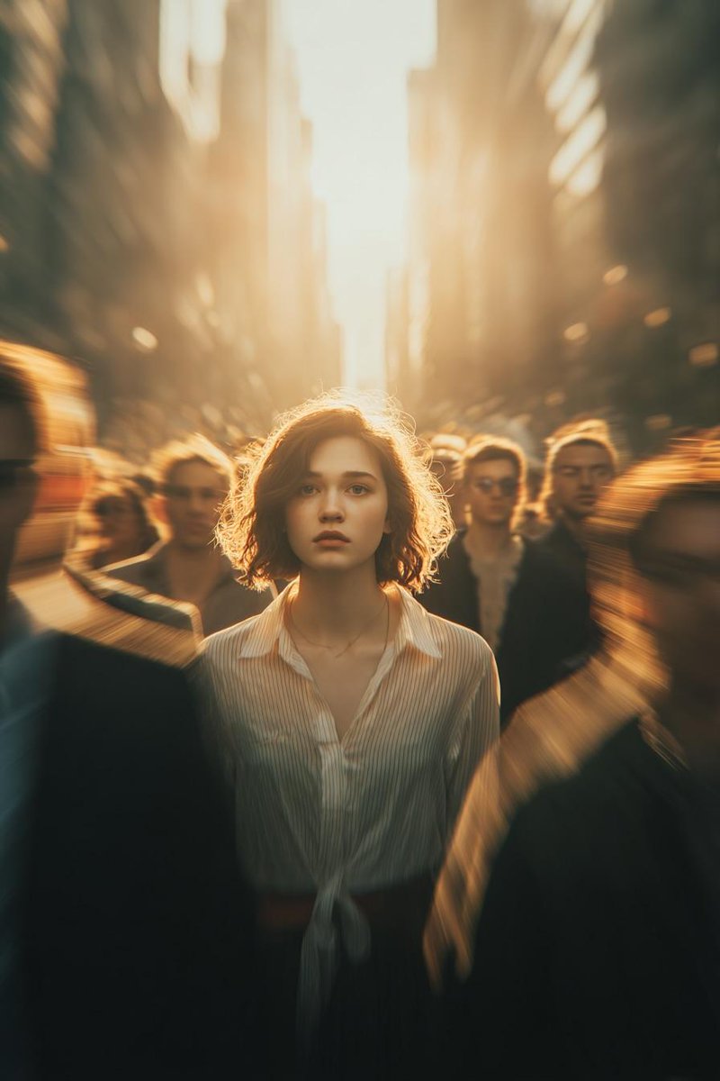 cinematic conceptual portrait of a young woman standing still inside a rushing urban crowd, extreme radial motion blur, frozen identity effect, dynamic speed distortion, intense light burst from behind, strong central composition, graphic cinematic framing, psychological tension, existential solitude in the city, emotional isolation narrative, bold warm color field, surreal realism, experimental fashion editorial style.