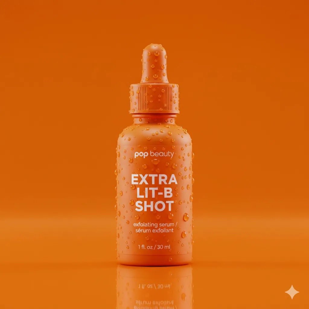 A vibrant orange glass dropper bottle of "pop beauty EXTRA LIT-B SHOT exfoliating serum / sérum exfoliant" (1 fl. oz / 30 ml). The bottle and dropper are covered in water droplets and sit on a reflective orange surface against a gradient orange background. A glowing, translucent orange spiral light effect wraps around the bottle.