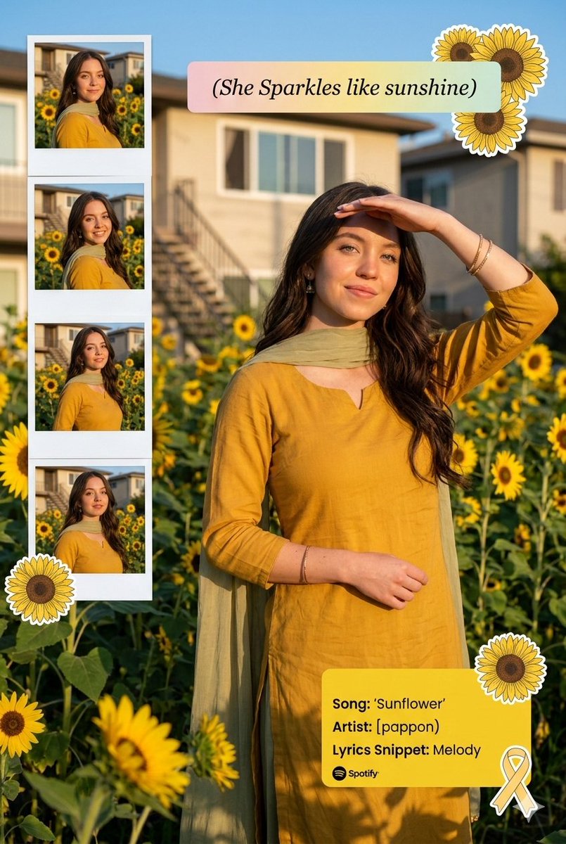 A complex, multi-layered prompt for Gemini Nano Banana Pro that takes an uploaded image of a woman and transforms it into a hyperrealistic DSLR-quality portrait set in a sunflower garden during golden