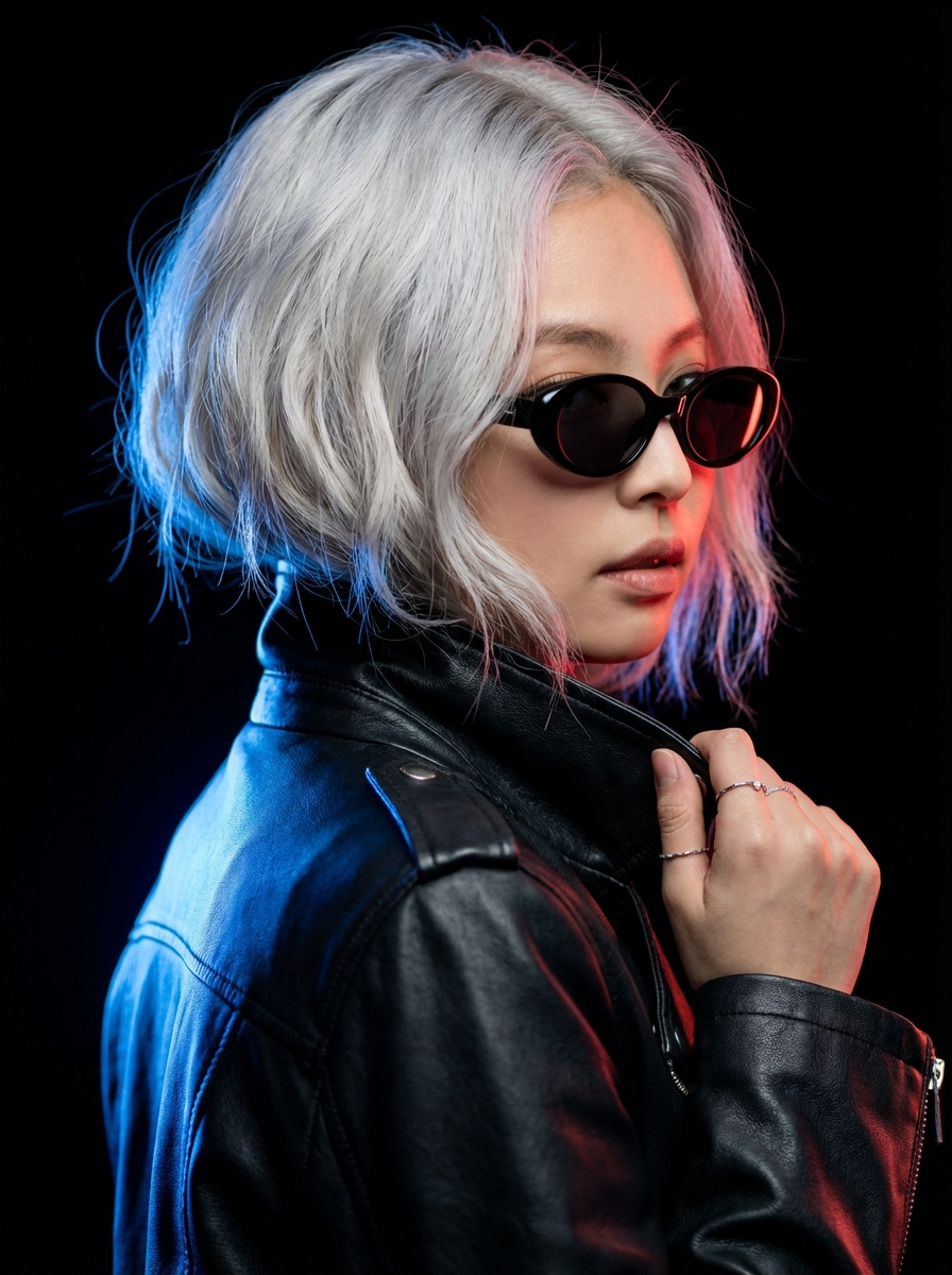 Hyper-realistic, cinematic medium close-up portrait cropped at upper chest level, head and shoulders framing only, a stylish young Korean woman Blackpink Jennie in a cool side-profile pose, looking back over her shoulder. She has silver-white platinum blonde short wavy bob hair with tousled texture. She wears black oval sunglasses and a black leather biker jacket with collar turned up. One hand is raised, gripping the lapel near the chest, wearing delicate silver rings on fingers. The image features dramatic dual-tone studio lighting: an intense blue rim light outlining the back and shoulder from the left, contrasting with a warm red edge light highlighting the right side of the face and sunglasses. The background is pitch black, creating high contrast. Tight framing with no space below the chest, face and sunglasses as the primary focal point. Commercial fashion photography, shallow depth of field, sharp focus on face, 85mm portrait lens, f/1.8, 8K resolution, photorealistic.