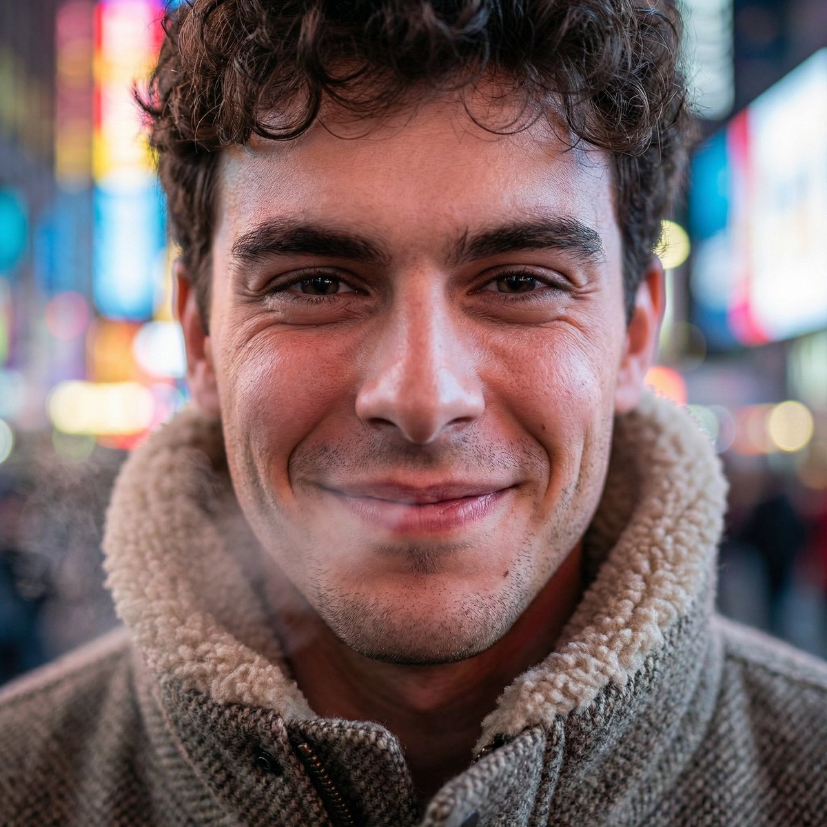 "camera_framing": "tight close-up shot with strong facial focus, shallow depth of field, soft bokeh from Times Square lights behind him",