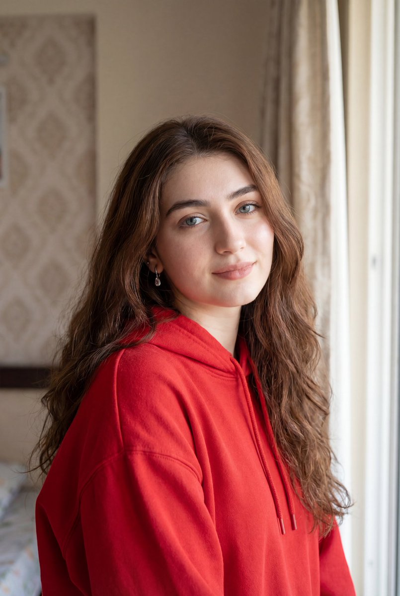 Ultra-realistic natural light portrait of a young woman with long wavy chestnut-brown hair, soft blue eyes, light natural makeup, and fair skin with subtle natural texture. She is wearing a bright red oversized hoodie slightly off one shoulder and small silver drop earrings. Gentle smile, relaxed expression, slight head tilt. Indoor setting with soft daylight coming from a window on the right, cozy modern bedroom background with patterned wallpaper and light curtains softly blurred. Warm neutral tones, shallow depth of field, 50mm lens, high detail skin texture, cinematic soft lighting, photorealistic, 4K resolution.