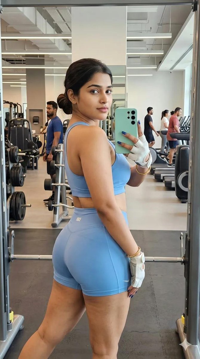 Create an image of an attractive woman wearing a light blue athletic gym outfit, including a fitted sports top and matching shorts with a bold minimalist logo text on the front. She is taking a mirror selfie inside a modern gym environment. Her expression is calm and serene. Her hair is styled in a medium-sized low bun at the back of her head. She has medium-length dark blue painted nails and is wearing white workout gloves. She is standing with her back slightly turned, one leg placed forward in a confident pose, looking over her shoulder toward the mirror. She holds a mint green modern smartphone in her right hand.