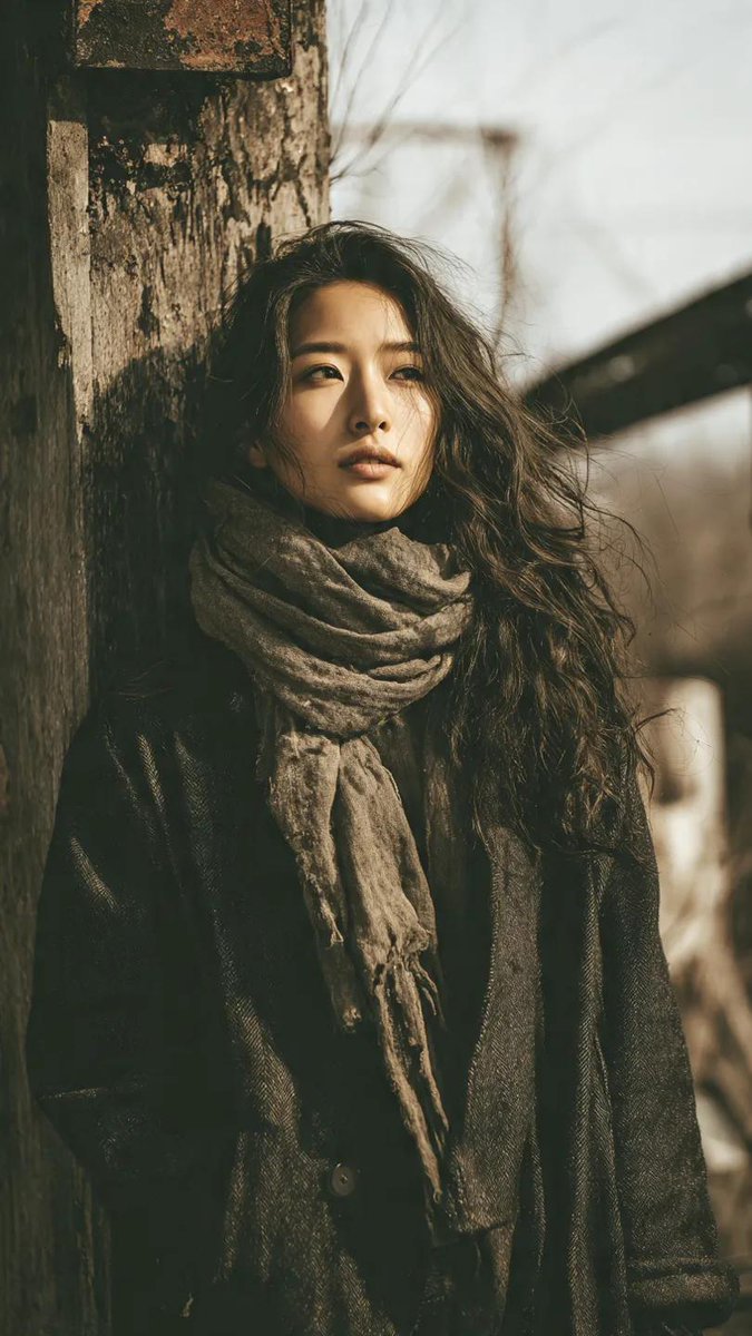 A gritty, classic portrait of a beautiful Japanese woman standing under soft, fading sunlight, leaning against an old, weathered tree. Her long, dark hair flows in the breeze, adding to the raw, natural aesthetic. She wears a worn-out scarf and a vintage, oversized coat, evoking a grunge vibe. The background features blurred, industrial elements with a slightly distressed urban feel. The image carries a muted, nostalgic film quality, with deep shadows and soft lighting, creating a moody, introspective atmosphere, reminiscent of 90s grunge fashion and photography