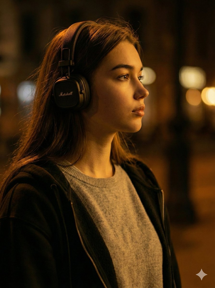 A detailed prompt for generating a moody, cinematic, and realistic candid profile portrait of a young woman wearing Marshall headphones, emphasizing rich warm amber lighting, dramatic low-key contrast