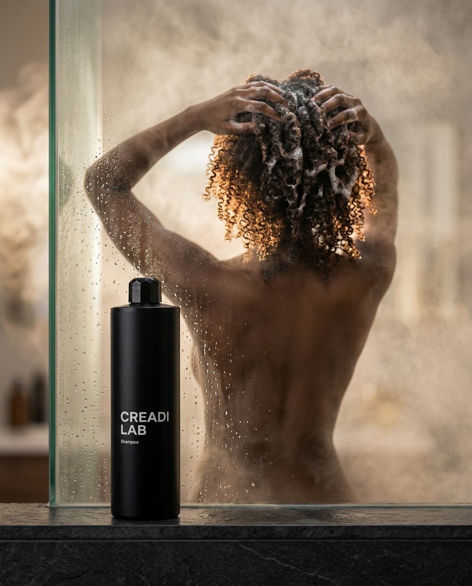 Cinematic over-the-shoulder composition. A gorgeous Black woman in a glass shower gently massages shampoo into her natural textured hair. The matte black “CREADI LAB – Shampoo” bottle is placed prominently in foreground on stone shelf, ultra sharp focus. Her blurred silhouette in background creates depth and elegance. Steam diffuses light softly, rim lighting enhances hair texture definition. 85mm lens, f/2.8, premium editorial campaign look, realistic water droplets, balanced exposure, luxury beauty advertisement style. Aspect ratio: 4:5