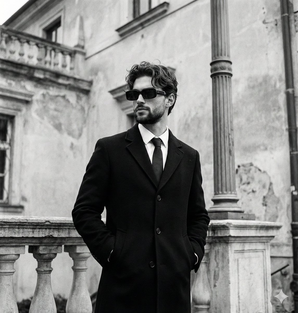 "primary_subject": "A stylish man wearing a tailored black topcoat, white shirt, dark tie, and rectangular sunglasses",