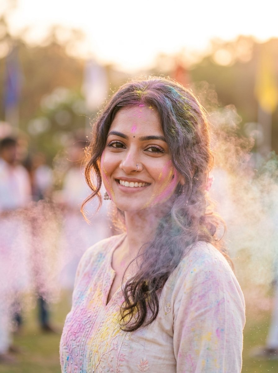 Soft dreamy aesthetic portrait of {argument name="person description" default="[describe person]"} celebrating Holi, pastel pink lavender yellow gulal powder gently floating around her face like mist, golden hour soft sunlight creating glowing rim light, serene joyful smile, ethereal atmosphere, shallow depth of field creamy bokeh, ultra-detailed skin texture, artistic photography style, 8k masterpiece