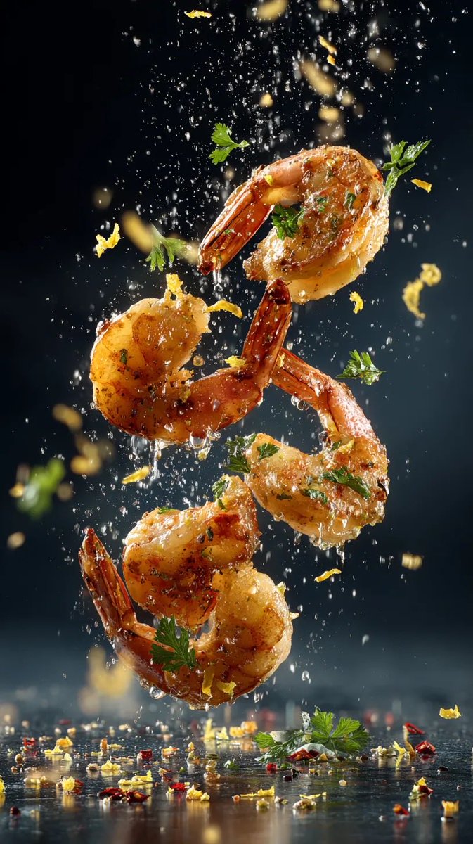 Ultra-realistic high-speed food photography of medium-rare steak slices suspended mid-air, dramatic black background, juicy pink center with crispy seared crust, coarse sea salt crystals exploding around, roasted baby potatoes floating, garlic cloves and fresh rosemary sprigs in motion, visible steam and seasoning particles, dynamic splash effect, studio strobe lighting, sharp focus, macro lens, extreme detail, glossy texture, dark moody atmosphere, professional commercial food photography, 8K resolution, freeze motion, hyper-detailed, shallow depth of field. ⸻ High-speed macro photography of golden grilled shrimp suspended in mid-air, water droplets and seasoning particles frozen in motion, fresh parsley leaves and lemon zest flying around, dramatic dark blue gradient background, glossy surface reflection below, vibrant warm tones, crispy edges with juicy texture, studio flash lighting, ultra-detailed, cinematic food styling, commercial seafood advertisement style, shallow depth of field, 8K ultra-realistic, dynamic splash composition, hyper-sharp focus, gourmet presentation.