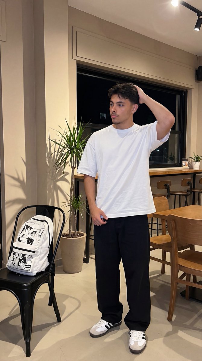 Create a photorealistic lifestyle/editorial photo shoot of the « casual flash in a street café » type, using a provided photo of a person as a reference. The person's appearance must be strictly identical to the model: perfectly recognizable face (100%), same facial proportions and geometry, same shape of eyes, nose, and lips, same complexion, same age, same hairstyle, and same hairline. Do not modify the face, do not « enhance » it, and do not change the gender. The setting is fixed: an evening café/lounge area (interior), beige walls, a large window overlooking the dark night, a wooden bar counter along the window, simple furniture: black metal chairs, wooden tables. To the left, a large potted indoor plant. No readable signs, logos, or text on the walls or windows. The composition is fixed: a vertical full-length shot, the camera at chest height, the person standing slightly to the right of center. In the foreground, on the left, a black metal chair is placed on a white backpack adorned with a black graphic print (no readable text). The background is slightly blurred, thus emphasizing the character. The lighting is fixed: a powerful flash (direct camera flash), marked shadows on the wall and floor, a « spam » photo style, like that of a compact camera or an iPhone. The attire is also fixed: an oversize white t-shirt without a logo or inscription, wide black pants, white sneakers with black stripes (retro style), a belt, a chain, or keys at the waist (unbranded) are acceptable. The pose is fixed: the person is standing, relaxed, next to the chair, the body slightly turned three-quarters; the right hand is raised and touches the head/hair (palm on the nape of the neck), the left hand is lowered near the hip. The legs: one leg is extended, the other slightly bent, the heel raised, creating a model posture. The head is turned to the side (left), the gaze is not fixed on the lens, the expression is calm and confident, without a smile. Quality/Style: ultra-realistic, sharp focus on the face, slight depth of field, natural complexion, light grain, no retouching, glossy appearance. Important: rigorously correct anatomy: two arms, two legs, five fingers, no deformities or supernumerary limbs.p