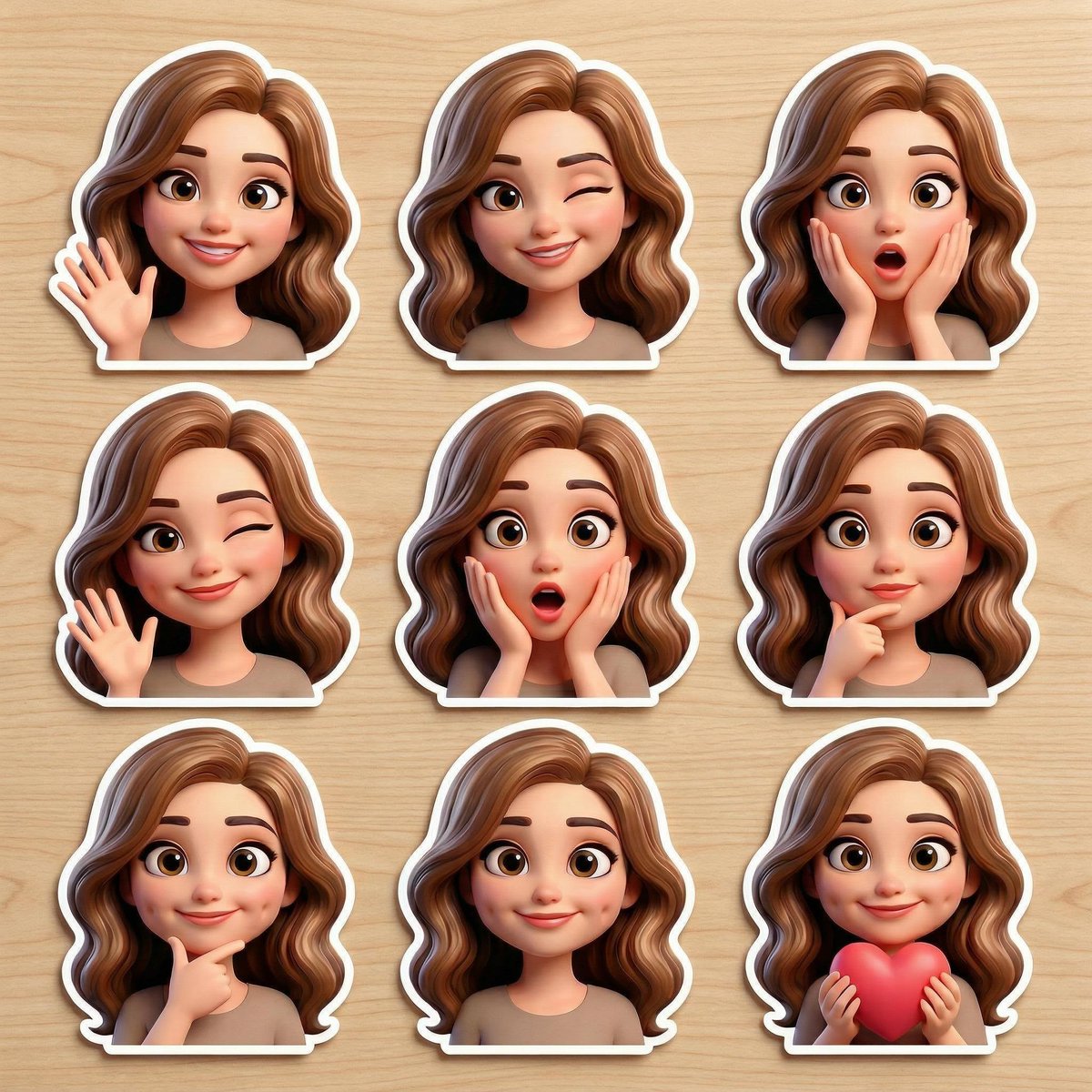 Using the uploaded selfie as strict face reference, keep identical facial features, hair, expression, and likeness. Create cute 3D Pixar-style avatar stickers: glossy 3D rendered cartoon character, soft lighting, depth with shadows, big sparkling eyes, chibi cute proportions, vibrant and fun. Generate multiple variations in one sheet - different poses, emotions like happy, cheeky wink, surprised - sticker format with clean edges and subtle border shadow, transparent background ready for use, high detail, 8K.