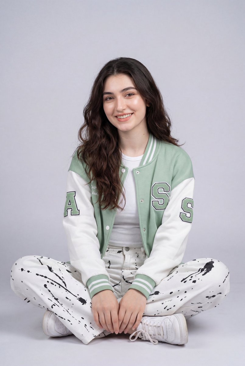 Studio portrait of a smiling young woman with long wavy dark brown hair, sitting cross-legged on a light gray floor against a plain soft gray background, wearing a pastel green and white varsity jacket with letter patches, white fitted t-shirt, loose white pants with abstract black splatter patterns, casual relaxed pose, natural makeup, warm friendly expression, soft even studio lighting, minimal shadows, clean modern aesthetic, high-resolution fashion photography, sharp focus, 85mm lens, professional studio setup, neutral color grading.