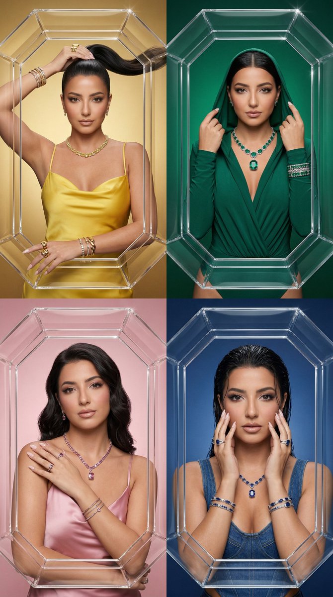 "notes": "Generate a high-end luxury jewelry campaign collage inspired by top fashion house campaigns. The same female model identity appears across all panels but with different elegant hairstyles and couture styling. Maintain the octagon crystal frame composition and strong monochrome color worlds."
