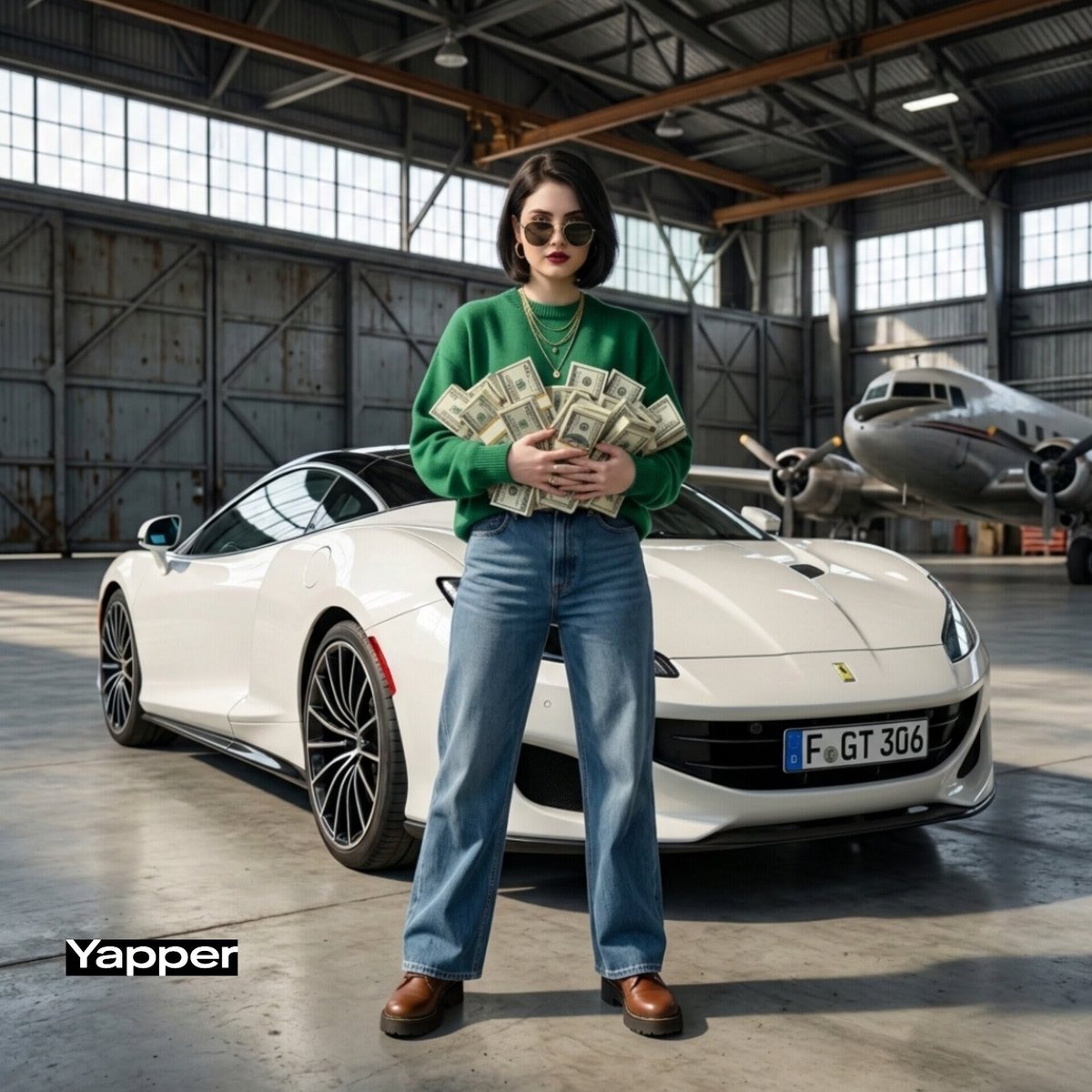 A prompt for generating an ultra-realistic cinematic photo of a confident, stylish woman standing in an industrial aircraft hangar next to a luxury sports car overflowing with stacks of cash, using so