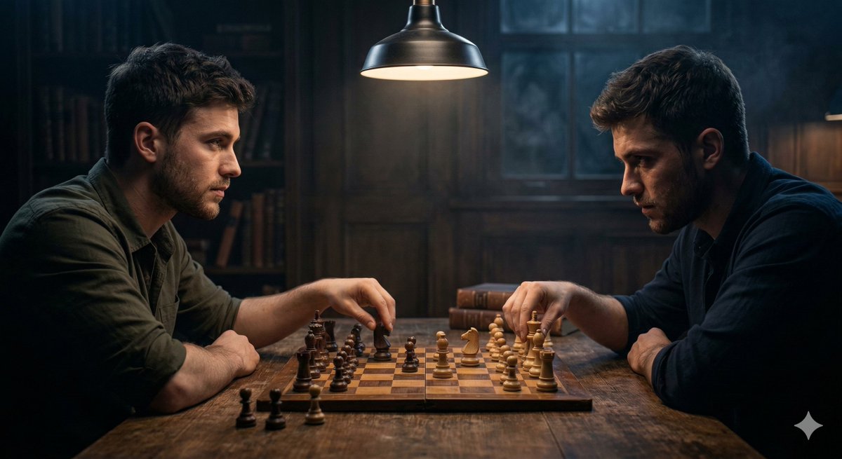 Ultra-realistic 8K cinematic scene of a young man is sitting at a wooden chess table in a dimly lit room, playing chess against himself. Two identical versions of him sit opposite each other, leaning slightly forward, elbows resting near the board, fingers gently touching chess pieces. They are locked eye-to-eye, intense and thoughtful, as if silently debating a life-altering move. Left version: calm, composed expression, neutral body language, subtle warm side lighting. Right version: slightly intense gaze, deeper shadows on face, dramatic low-key lighting. A single overhead pendant light casts a focused beam on the chessboard, creating sharp shadows and a moody atmosphere. Background fades into darkness with soft cinematic haze. The chess pieces are mid-game, symbolizing internal conflict and strategic thinking. Camera angle: medium close-up, eye-level perspective, shallow depth of field, sharp focus on both faces and the chessboard. Color tone: dark cinematic blues and warm highlights. Mood: psychological tension, introspection, duality, silent confrontation. Hyper-detailed skin texture, realistic muscle definition (average athletic build, not exaggerated), natural posture, dramatic contrast lighting, editorial photography style.