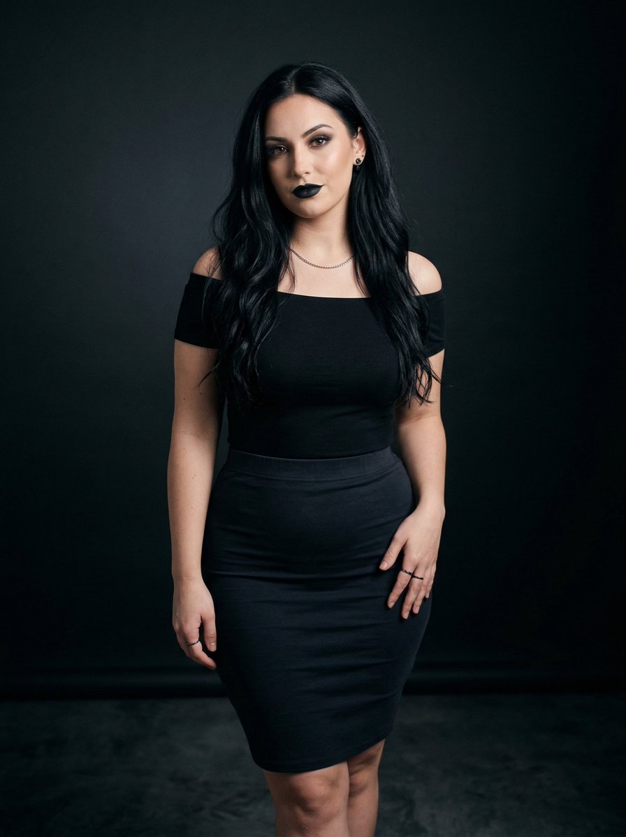 A JSON prompt for generating a highly detailed, realistic portrait of a curvy young woman in a 'black on black' outfit, emphasizing a modern, slightly gothic aesthetic. It specifies the subject's feat