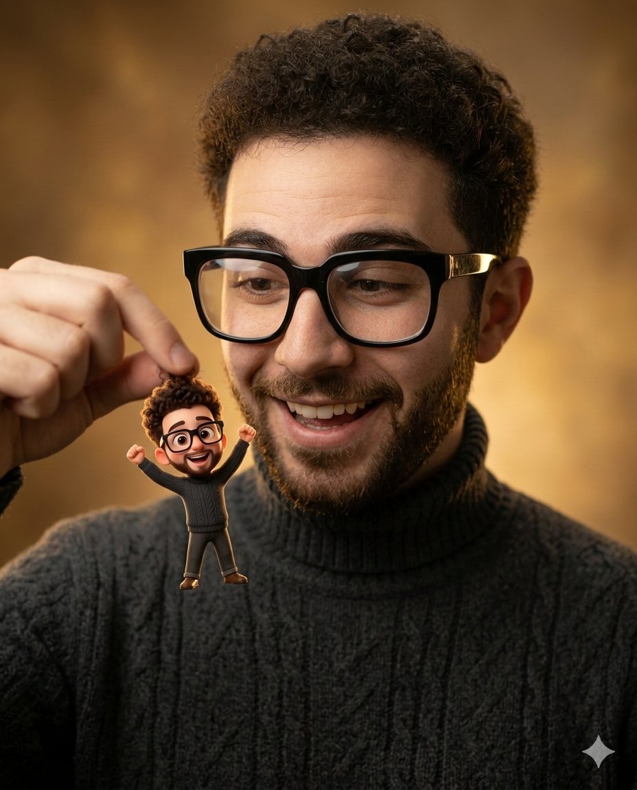 Photorealistic Subject Holding Miniature Cartoon Self — Nano Banana Pro AI Generated Image