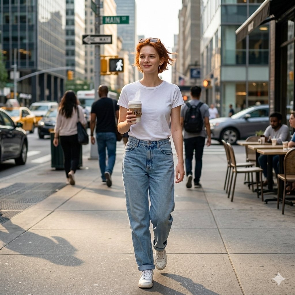 A highly realistic daytime street photo of a young woman walking across a busy city sidewalk. She is mid step, looking ahead naturally with a relaxed confident expression. Her hair moves slightly in the breeze. She is wearing a casual outfit, a {argument name="top color" default="white"} t shirt, light loose baggie blue jeans, and sneakers, with sunglasses resting on her head. In one hand she is holding a coffee cup.