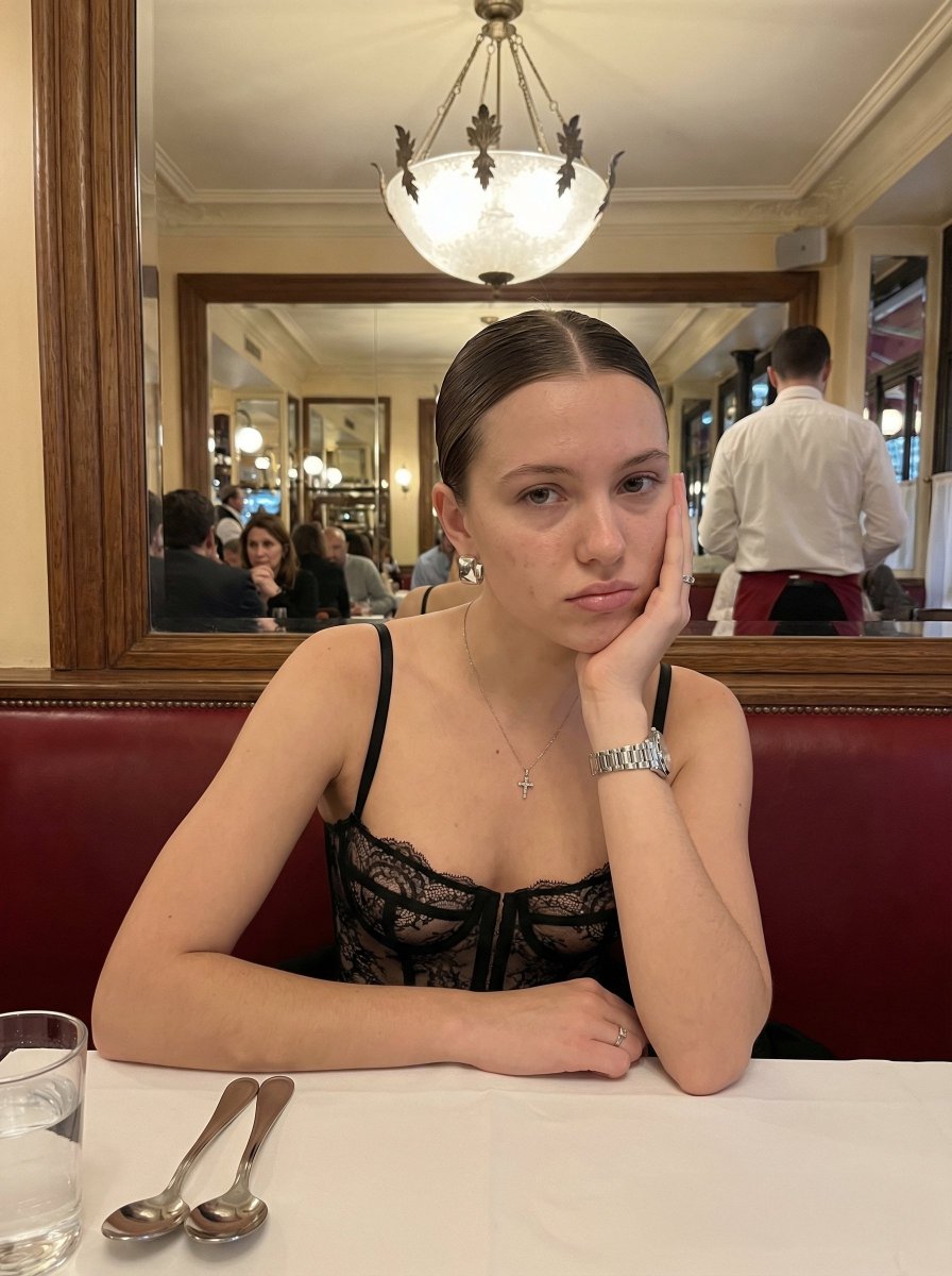 "description": "A young woman sitting at a restaurant table, leaning forward with her chin resting on her right hand. She has fair skin with natural, non-uniform texture and slight facial shadows. Her hair is brown, slicked back into a tight, low bun with a clean center part.",