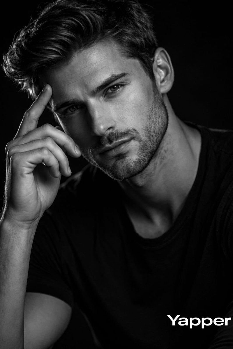 Pose him in a thoughtful pose with one hand resting gently on his chin, head slightly angled toward the camera. His hair should look natural with visible strand detail, and if facial hair is present, it should appear well-defined and realistic.