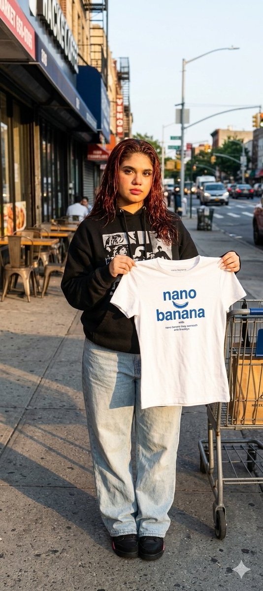 Female model standing on a city street during golden hour. Natural sunlight hitting from the side, creating warm highlights and soft shadows. Casual streetwear pose relaxed stance, looking slightly off camera. Urban background with sidewalk, parked shopping cart, storefront with outdoor seating, subtle greenery, and street details. Realistic everyday environment. Full body shot. Slightly candid, lifestyle photography feel. Eye level camera angle. Natural depth of field. Keep the garment realistic and undistorted no warping of logos or graphics. Maintain correct scale and print alignment. Photorealistic. 8K resolution. Natural color grading. No added text. No watermark.