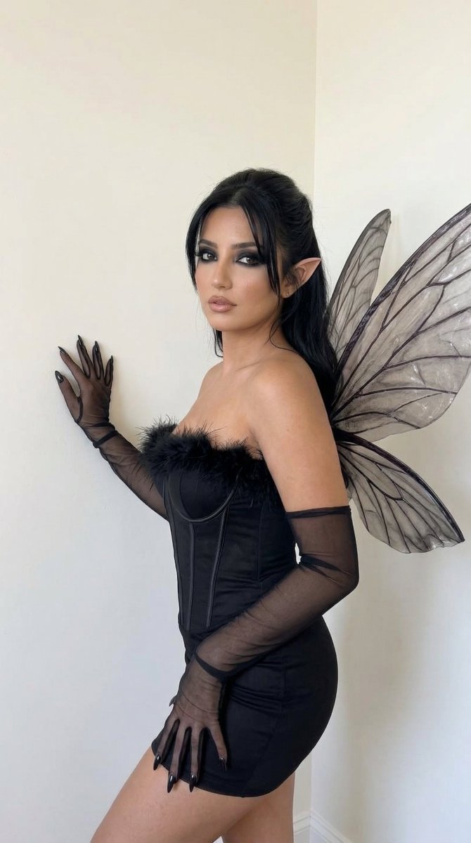 "notes": "Create a dark fantasy fashion portrait of one glamorous fairy-like woman in a minimal interior space."