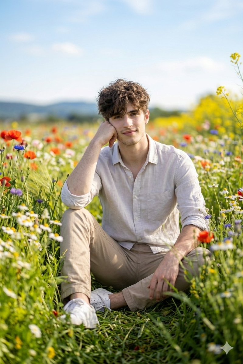 A highly realistic portrait of a young man standing in a wide spring flower field during a bright sunny day. Colorful wildflowers bloom all around him while a gentle breeze moves through the grass and flowers. He stands relaxed with a soft smile, looking slightly toward the camera. He is wearing a light cotton shirt with rolled sleeves, beige chinos, and simple sneakers.