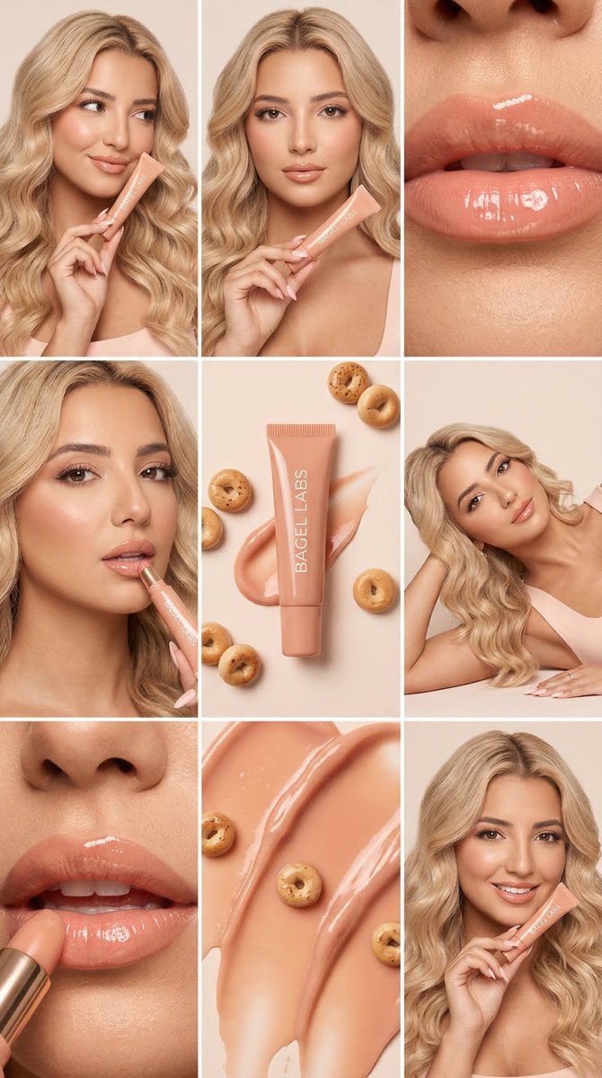 A highly structured JSON prompt for Nano Banana 2 to generate a 3x3 grid of images for a luxury beauty editorial campaign (BAGEL LABS Peach Gloss Balm). It specifies the model, product details, lighti